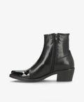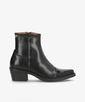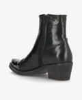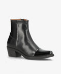 CARMINA P fra shoedesign copenhagen er den perfekte støvle til dig, der elsker et stilrent og feminint udtryk med et strejf af attitude. Støvlen er designet i sort skind med elegant kontrast på snuden i sort laklæder, som tilføjer et eksklusivt shine til dit look. Den spidse snude og den medium høje blokhæl giver en sofistikeret silhuet, der både forlænger benene og sikrer komfort hele dagen.